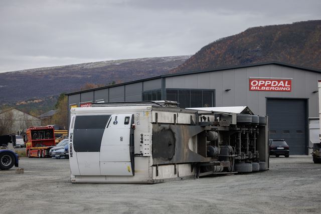 Det var ikke bare bygninger som ble ødelagt da Amy traff Oppdal. Denne digre hengeren klarte ikke å stå imot den kraftige vinden. Foto: Espen Sjølingstad Hoen/VG/NTB